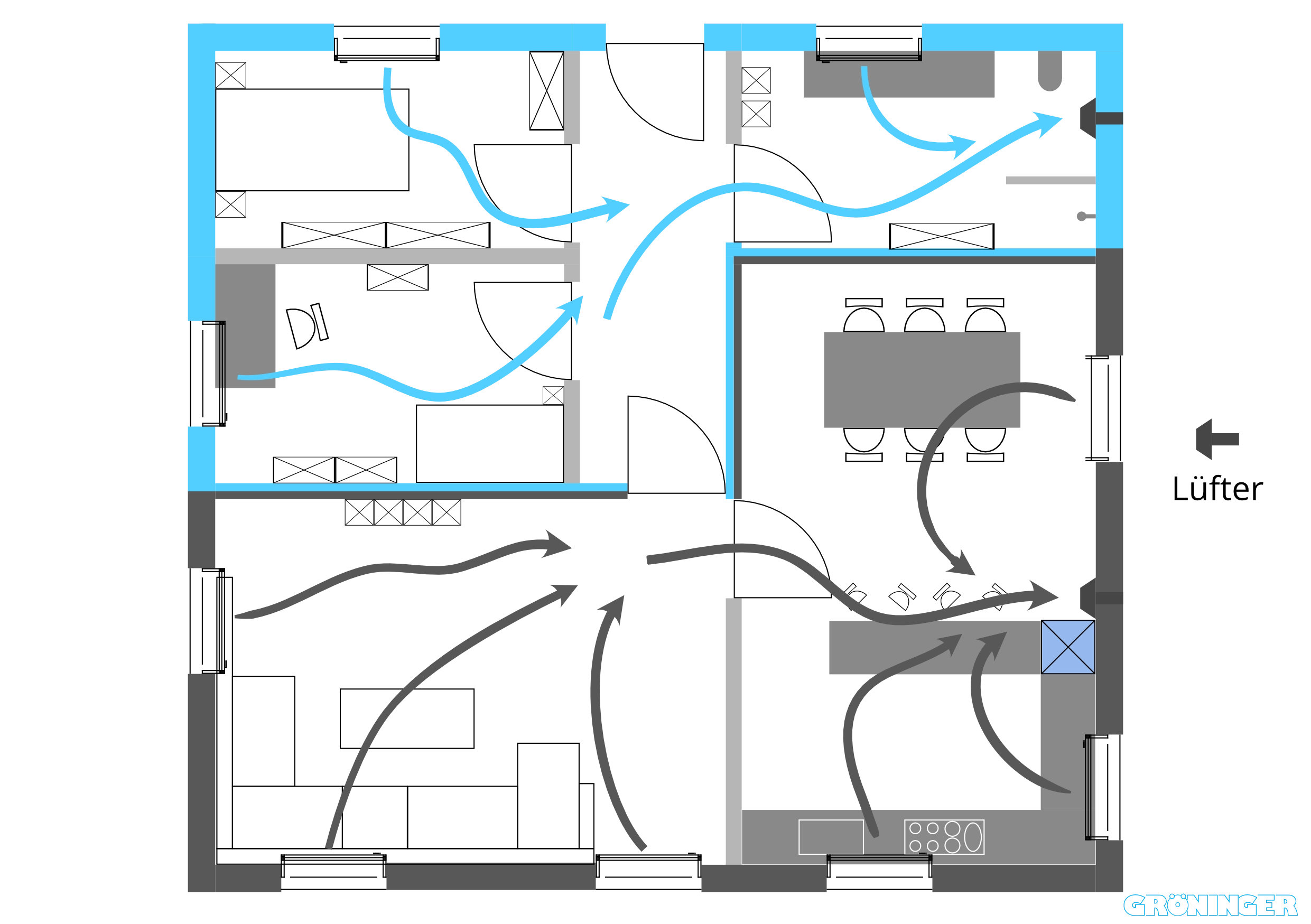 Um einen hohen Luftaustausch zu gewährleisten, wird der DK-100 mit einem Badlüfter kombiniert. Der Lüfter befördert die verbrauchte Luft nach außen und die frische Luft strömt über die gekippten Fenster nach.